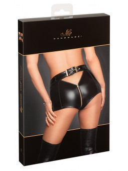 Mini-jupe moulante de Noir dans un noble Powerwetlook noir. Empiècement en dentelle transparente à l'arrière, laçage élastique par-dessus grâce à des œillets décoratifs. Le mélange de matières souples et élastiques garantit une tenue à fleur de peau et un grand confort.