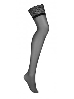 Bas jarretelles noirs Chemeris d’Obsessive avec larges bandes de cuisse en dentelle élastique. Doux et soyeux. Clip-on.