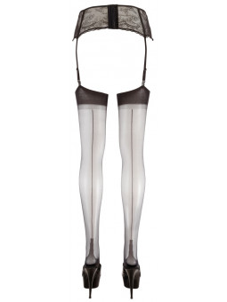 Bas de jarretelle soyeux avec dessus uni, couture décorative et talon haut.