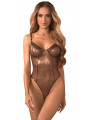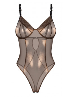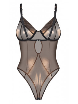 Body ouvert Soranna d'Obsessive dans un style Rio très serré avec des jambes très échancrées. Semi-transparent de couleur bronze avec de nobles reflets. Les détails noirs apportent une touche de style. Élastique sur tout le pourtour et doux au toucher pour un confort optimal. Bonnets à armatures et petite fermeture dans le dos. Les bretelles noires sont réglables. Ouverture séduisante à l'entrejambe.