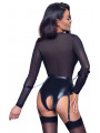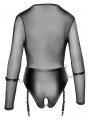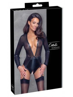 Body porte-jarretelles extra bas de Cottelli BONDAGE avec top transparent à manches longues en powernet et partie culotte complètement sans entrejambe en look mat très tendance - tenue idéale pour le sexe spontané ! Ceinture solidement cousue avec 2 anneaux à l'avant et un anneau de chaque côté pour fixer les menottes jointes avec des chaînes à mousqueton. Menottes avec fermetures velcro réglables. Les bretelles réglables sont amovibles.