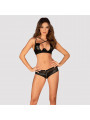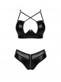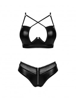 ensemble noir 2 pièces Norides de Obsessive avec soutien-gorge à armatures et slip en wetlook qui s'adapte de manière élastique et douce. Soutien-gorge à armatures au style raffiné avec des lanières et un décolleté extravagant. Les bretelles sont réglables - tout comme la fermeture à crochets dans le dos. Le slip séduit par ses empiècements en dentelle à la taille et sa fermeture éclair sur le devant.