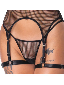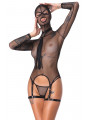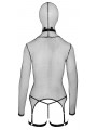 Ensemble extravagant en résille noire de Bad Kitty composé d'un porte-jarretelles avec masque pour la tête, d'un petit string et d'un collier avec mini-fouet. La résille élastique s'adapte à la peau de manière douce et confortable. Le collier choker réglable et le flogger amovible de 34 cm de long sont fabriqués en similicuir stylé. Le porte-jarretelles à manches longues est équipé de jarretelles élastiques et de sangles pour les cuisses, chacune étant réglable de manière adaptée. Le masque de tête avec des ouvertures pour les yeux et la bouche est solidement cousu. Le petit string en résille complète le look transparent excitant.