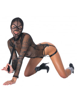 Ensemble extravagant en résille noire de Bad Kitty composé d'un porte-jarretelles avec masque pour la tête, d'un petit string et d'un collier avec mini-fouet. La résille élastique s'adapte à la peau de manière douce et confortable. Le collier choker réglable et le flogger amovible de 34 cm de long sont fabriqués en similicuir stylé. Le porte-jarretelles à manches longues est équipé de jarretelles élastiques et de sangles pour les cuisses, chacune étant réglable de manière adaptée. Le masque de tête avec des ouvertures pour les yeux et la bouche est solidement cousu. Le petit string en résille complète le look transparent excitant.