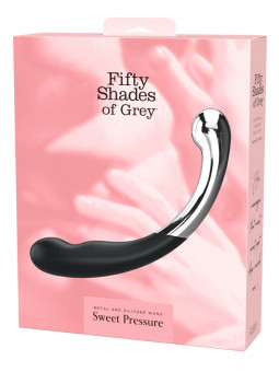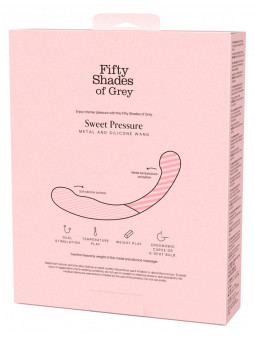 Le Metal and Silicone Wand Sweet Pressure de Fifty Shades of Grey allie un silicone soyeux et un métal noble dans un double godemiché à la courbure optimale. Ce jouet réversible peut être utilisé de multiples façons en solo ou lors de jeux amoureux. Le mélange de matériaux de haute qualité avec une surface lisse sur tout le pourtour glisse comme par magie sur la peau et dans les profondeurs intimes. Les têtes saillantes stimulent de manière ciblée la zone G ou la prostate. Le godemiché en métal peut en outre être chauffé ou refroidi au bain-marie pour des jeux de température raffinés.