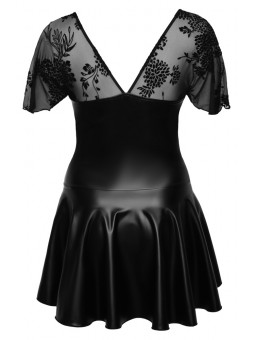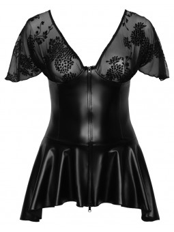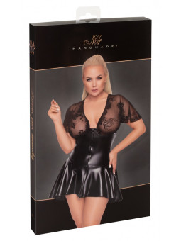 Robe courte et moulante de Noir Handmade Curves dans un powerwetlook noir noble avec un tulle imprimé de flocons de velours comme partie supérieure profondément décolletée. Fermeture éclair sur toute la longueur à l'avant, du nombril à l'ourlet. Dos nu - le tour de cou se ferme avec des boutons. Élastique sur tout le pourtour et ne se déforme pas pour un maximum de confort.