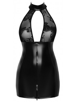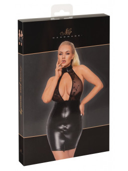 Robe courte de Noir Handmade Curves dans un style corsaire avec une petite jupe légèrement évasée. Dans un powerwetlook noir noble avec un haut profondément décolleté et des manches courtes et larges en tulle imprimé flocon de velours. Fermeture éclair sur toute la longueur à l'avant. Élastique sur tout le pourtour et ajusté pour un confort maximal.