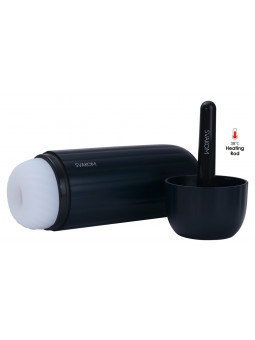 Le masturbateur stylé et maniable contient un manchon en TPE à rainures et picots d'aspect neutre. Le matériau souple semblable à la peau procure (en combinaison avec du lubrifiant et la fonction de chaleur) des sensations réalistes comme dans une bouche douce et une gorge profonde. Le manchon est amovible pour un nettoyage facile.
