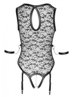 Corps de jarretelle de Cottelli BONDAGE en délicate dentelle douce avec des détails excitants en aspect mat. Garni à l'avant d'un harnais composé de sangles et d'anneaux doux d'aspect mat. Les sangles souples incluses pour les bras peuvent être facilement accrochées aux anneaux latéraux de la taille avec leurs chaînes à mousqueton. L'entrejambe complètement ouvert est doté d'une chaîne d'entrejambe stimulante et amovible. L'encolure est ornée d'un petit anneau à l'avant et se ferme à l'arrière par un petit bouton pression. Sangles de cheville avec fermetures velcro réglables. Les bretelles réglables sont amovibles.