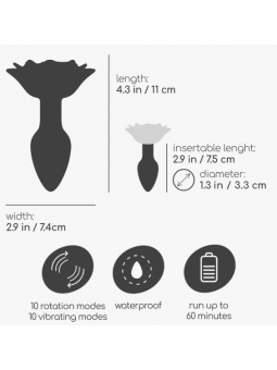 Tu ne peux pas dire que tu n’as pas de fleurs ! Cette histoire d’amour romantique se termine par un petit mort agréable... Giulietta propose une rotation innovante de 360° disponible en 10 modes différents, et la vibration est également disponible en 10 modes. Les deux sont facilement contrôlables à la base de la prise et via la télécommande. Giulietta est parfaite pour jouer en couple, permet à votre partenaire de garder la télécommande et peut vous surprendre avec la plus délicieuse stimulation anale. Rechargeable via un câble USB, il assure des modes puissants et stables du début à la fin. Veuillez charger complètement avant utilisation. La lumière clignote quand vous branchez le chargeur pour signaler que la batterie est en charge. Lorsque la charge est terminée, la lumière reste stable. Charge complète pendant 150 minutes. Utilise le plug pendant 60 minutes. La télécommande fonctionne avec une batterie CR2023 3V incluse. Distance de 10 à 15 mètres en espace ouvert. Veuillez retirer la batterie lorsqu’elle n’est pas utilisée. Le nettoyage est super simple, lavez-vous à l’eau tiède et un savon doux ou utilisez un spray nettoyant pour jouets. Utilisez un spray antibactérien pour obtenir de meilleurs résultats. Sécher et conserver à l’écart de la lumière et de la chaleur. L’utilisation de lubrifiant est conseillée. Utilisez toujours des lubrifiants à base d’eau. Les huiles et autres types de lubrifiants endommageront l’intégrité du matériau. Les lubrifiants écrasants sont le meilleur ajout à vos jouets écrasants. Consultez le manuel d’instructions avant utilisation. Dimensions : 7,7 cm de long ; 3,5 cm de diamètre. Matériau : Silicone, ABS