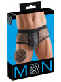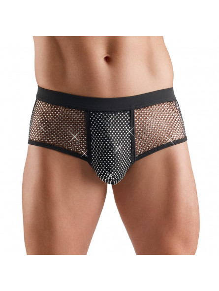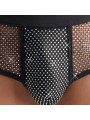 Slip noir soulignant de Svenjoyment avec un devant scintillant : la poche opaque et les empiècements en résille devant sont recouverts de petites pierres scintillantes. Les fesses sont couvertes. Les pantalons sont souples et élastiques sur tout le pourtour ainsi qu'avec un élastique à la taille pour un maximum de confort.