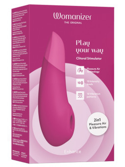 L'ENHANCE ergonomique et maniable de Womanizer enthousiasme avec la nouvelle combinaison unique de la technologie Pleasure Air et de la vibration We-Vibe ultra puissante. Les ondes de pression pulsées gâtent le clitoris sans le toucher, tandis que les vibrations profondes et puissantes se répandent sur toute la vulve. Le point culminant arrive rapidement et de manière fiable - des orgasmes pour tous !