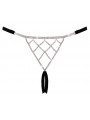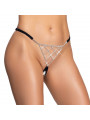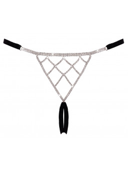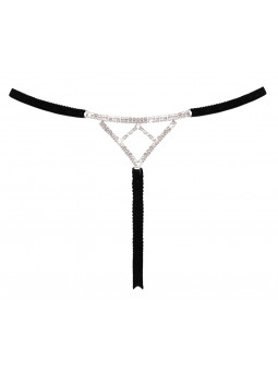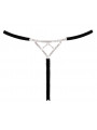 String ouvert luxueux de Cottelli LINGERIE en bandes stretch noires douces avec accessoires argentés. L'avant décoratif et le triangle arrière décoratif sont travaillés avec d'innombrables pierres de strass scintillantes. Les bandes élastiques latérales à la taille sont réglables. Séduisant et ouvert à l'entrejambe.